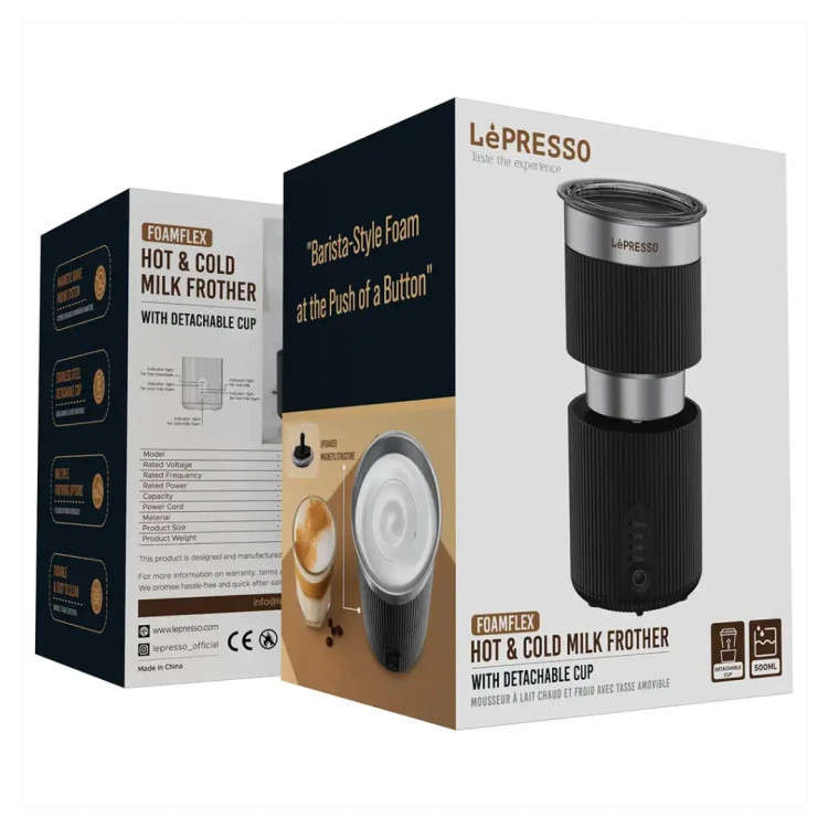 با فومفِلکس شیر داغ و سرد لپرسو، در خانه فوم شیر حرفهای درست کنید! این دستگاه ۵۰۰ وات با ظرفیت ۵۰۰ میلیلیتر، شیر را هم برای نوشیدنیهای داغ و هم سرد آماده میکند. سیستم مخلوطکن مغناطیسی، فوم نرم و خامهای میسازد و بافت آن را میتوانید مطابق سلیقه خود تنظیم کنید. فنجان استیل جداشدنی تمیز کردن دستگاه را آسان میکند و بدنه مقاوم از استیل و پلاستیک با کیفیت، دوام طولانی را تضمین میکند. تنها با یک دکمه، فوم شیر بینقص برای کاپوچینو، لاته یا هر نوشیدنی دلخواهتان آماده میشود!
