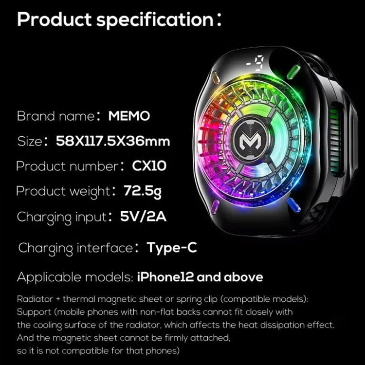 فن خنک کننده گوشی موبایل Memo CX10 یک خنککننده قدرتمند و حرفهای است که مخصوص استفاده طولانیمدت، بازیهای سنگین و کاربرانی طراحی شده که نمیخواهند گوشیشان حتی یک لحظه داغ کند. این کولر با استفاده از ماژول خنککننده نیمههادی (TEC) دمای پشت گوشی را در مدت بسیار کوتاه پایین میآورد و عملکرد دستگاه را در سنگینترین شرایط پایدار نگه میدارد.