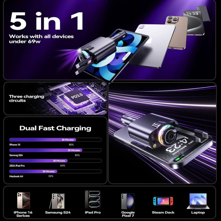 این محصول ترکیبی هوشمند از شارژ سریع 45 واتی، پخش عطر نانویی و نورپردازی کهکشانی است که نهتنها کاربردی بلکه جلوهای مدرن و خاص به داخل خودرو میبخشد.