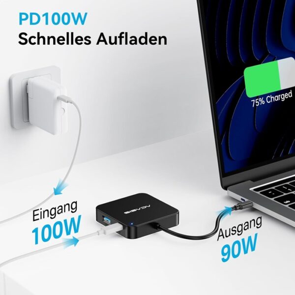 در کنار خروجیهای تصویر، این هاب به پورتهای USB پرسرعت (احتمالاً USB 3.0 بر اساس رنگ آبی پورتهای جانبی) مجهز شده است که برای اتصال موس، کیبورد، فلش مموری و هارد اکسترنال کاملاً ایدهآل هستند. علاوه بر این، نگران تمام شدن باتری لپتاپ خود نباشید؛ پورت شارژ PD (Power Delivery) تعبیه شده روی این دستگاه، به شما اجازه میدهد شارژر لپتاپ را مستقیماً به هاب متصل کرده و دستگاه خود را با سرعت بالا شارژ کنید.