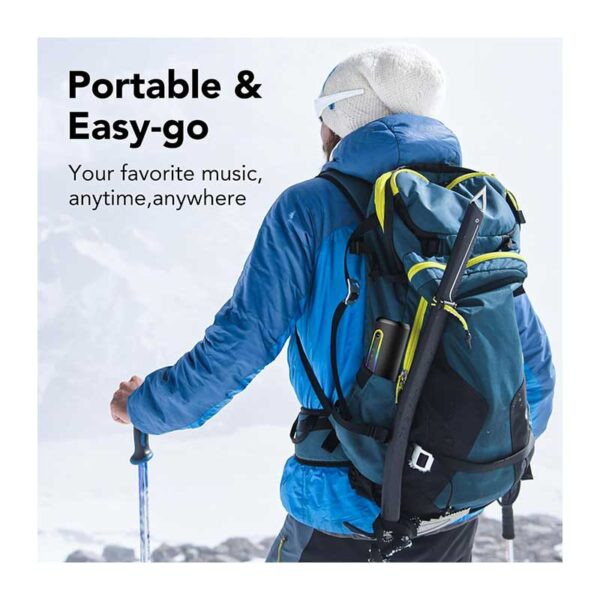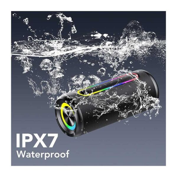 اسپیکر بلوتوثی قابل حمل، ضد آب IPX7 و مقاوم: بدنه این اسپیکر از پارچه فیبری محکم ساخته شده و دو حلقه لاستیکی EVA در هر دو انتهای آن قرار دارد، بنابراین حتی در صورت افتادن از ارتفاع ۳ متری آسیبی نخواهد دید. این اسپیکر دارای استاندارد IPX7 است و میتواند به مدت ۳۰ دقیقه در عمق ۳.۸ فوتی آب غوطهور شود. بسیار مناسب برای استفاده هنگام دوش گرفتن، کمپینگ در فضای باز، کوهنوردی و دوچرخهسواری است.