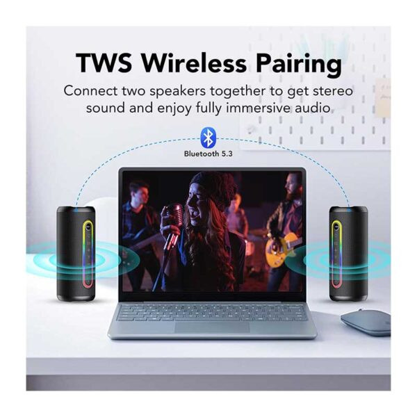 استریو TWS و نور RGB: اسپیکر بلوتوثی دارای قابلیت اتصال TWS است که امکان اتصال همزمان دو اسپیکر بیسیم را فراهم میکند و اثر صدای استریو ۳۶۰ درجه ایجاد میکند، همانند تجربه یک سینمای خصوصی لوکس. این اسپیکر افکتهای نور RGB متنوعی ارائه میدهد، با بیش از ۲۰ رنگ و ۴ حالت نورپردازی مختلف که نیازهای ۸۰ موقعیت مهمانی متفاوت را پوشش میدهد (چراغهای RGB بهصورت دستی قابل خاموش شدن هستند).