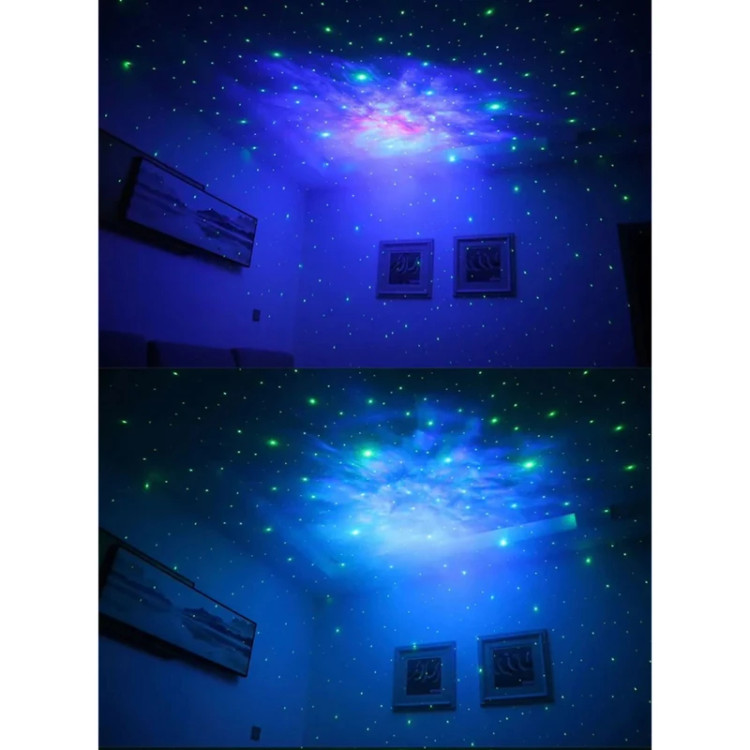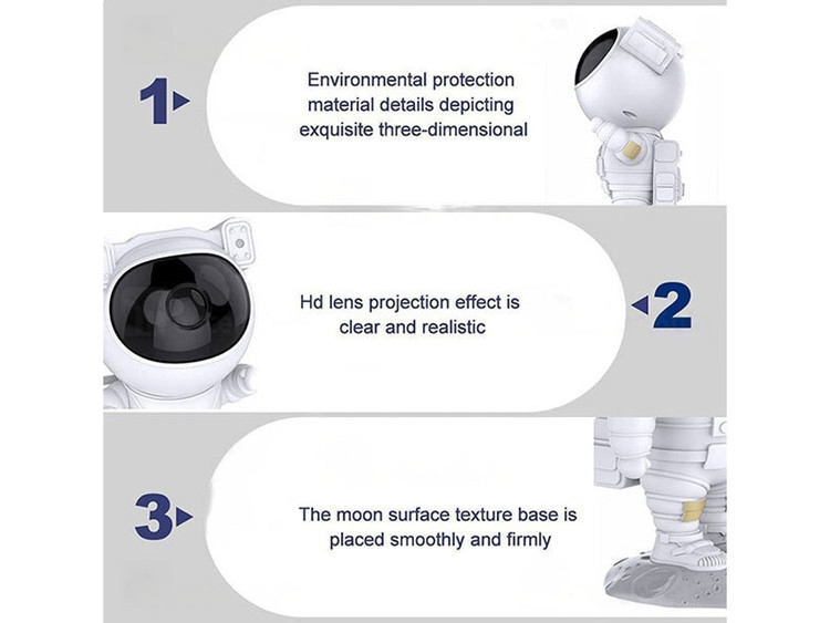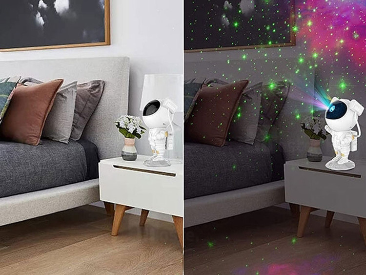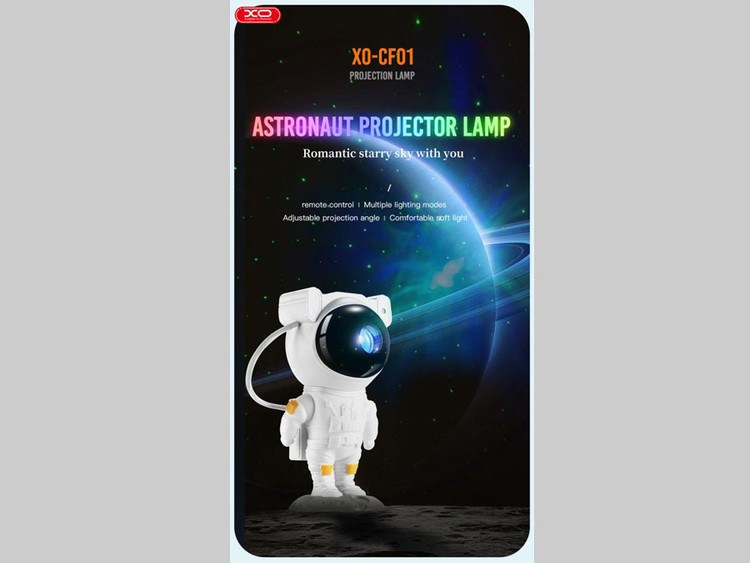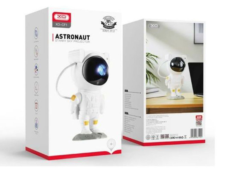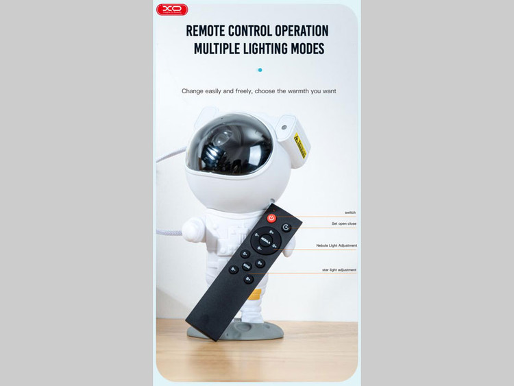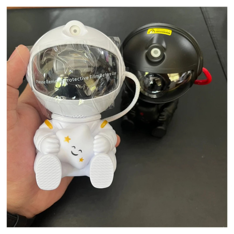 پروژکتور کهکشانی طرح فضانورد نشسته یک چراغ خواب با قابلیت پخش افکت تصویر زنده کهکشانی بر روی سقف و دیوار اتاق است که به همراه افکت لیزر ستاره ای حس یک سفر کهکشانی را قبل از خواب به شما میدهد . تلفیق همزمان تصویر زنده کهکشانی و لیزر ستاره ای جذابیت اتاق خواب شما را چندین برابر میکند . این محصول دارای ریموت کنترل نیز می باشد که میتواند نور پرژکتور یا لیزر را کم یا زیاد و یا برای روشن ماندن محصول تایمر تعریف کنید . برای روشن کردن این محصول باید از آداپتور موبایل استفاده کنید و از طریق کابل داخل بسته بندی آن را شارژ نمایید.