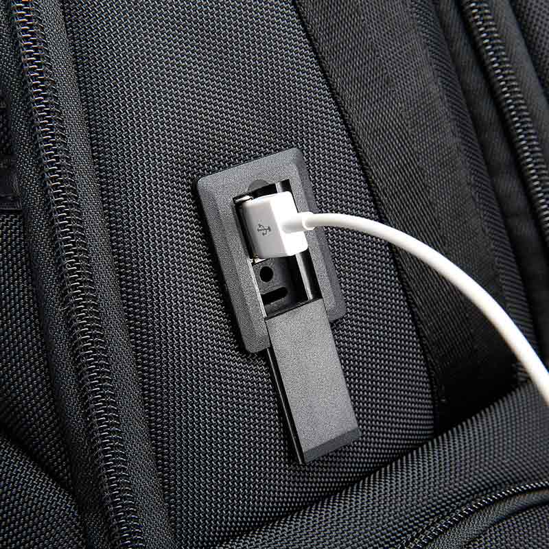 در قسمت کناری کوله یک پورت USB با درپوش محافظ قرار دارد که برای شارژ موبایل و سایر دستگاهها از طریق پاوربانک داخلی قابل استفاده است. فقط کافیست پاوربانک خود را داخل کوله متصل کرده و کابل شارژ را به درگاه بیرونی وصل نمایید.