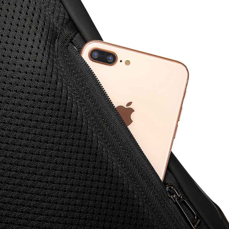 در قسمت جلویی کوله پشتی، یک جیب بزرگ زیپدار برای لوازم ضروری مثل تلفن همراه، خودکار، نوتبوک و پاوربانک تعبیه شده است. این جیب دارای جاکلیدی جمعشونده است تا کلیدها همیشه در دسترس باشند.