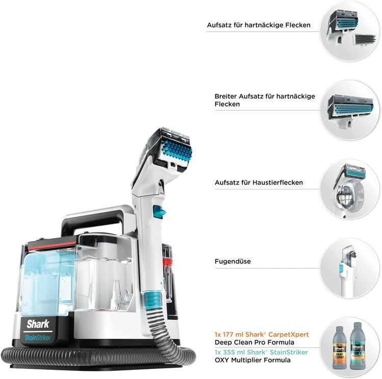 شامل: StainStriker (شاخه اتحادیه اروپا)، اتصال لکه حیوانات خانگی، ابزارهای لکهگیر عریض و معمولی، ابزار تمیز کردن شکاف و شلنگ، بطریهای شروع محلول Shark CarpetXpert و StainStriker. 450 وات وزن: 3.8 کیلوگرم. رنگ: سفید/فیروزه ای