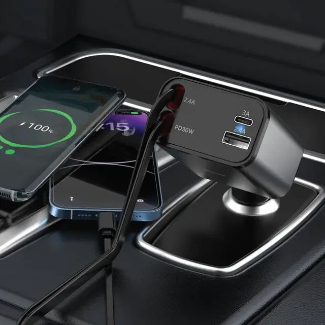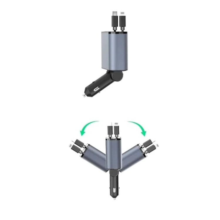 شارژر ماشین جمع شونده 50 واتی رانندگی را بسیار جالب تر می کند. دارای یک کابل Type-c (PD 30W) و یک کابل جمع شونده لایتنینگ است. در صورت خروجی، یک USB-C و یک USB-A دارید. این قابلیت شارژ به این شارژر خودرو اجازه می دهد تا 3 دستگاه را به طور همزمان شارژ کند. برای اطمینان از دوام و استقامت با ABS ساخته شده است. همچنین مجهز به فیوز ایمنی داخلی برای محافظت در برابر جریان بیش از حد و اتصال کوتاه است.