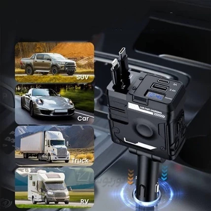 شارژر فندکی 4 کاره طراحی هوشمندانه با سیم سرخود و سیم جمکن داخلی