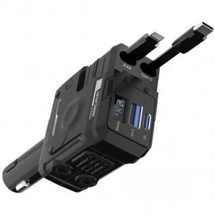 یکی از ویژگیهای برجسته این شارژر، مجهز بودن به سیم سرخود است که شامل دو کانکتور پرکاربرد تایپسی (-C) و لایتنینگ (مخصوص آیفون) میباشد. این طراحی باعث میشود دیگر نیازی به حمل چند کابل مختلف در خودرو نداشته باشید. علاوه بر این، وجود سیستم سیم جمکن داخلی، نظم و ترتیب فوقالعادهای به فضای خودرو میبخشد و از گرهخوردگی و آسیب به سیمها جلوگیری میکند. تنها با یک حرکت ساده، سیم جمع میشود و همیشه مرتب در دسترس قرار دارد.