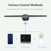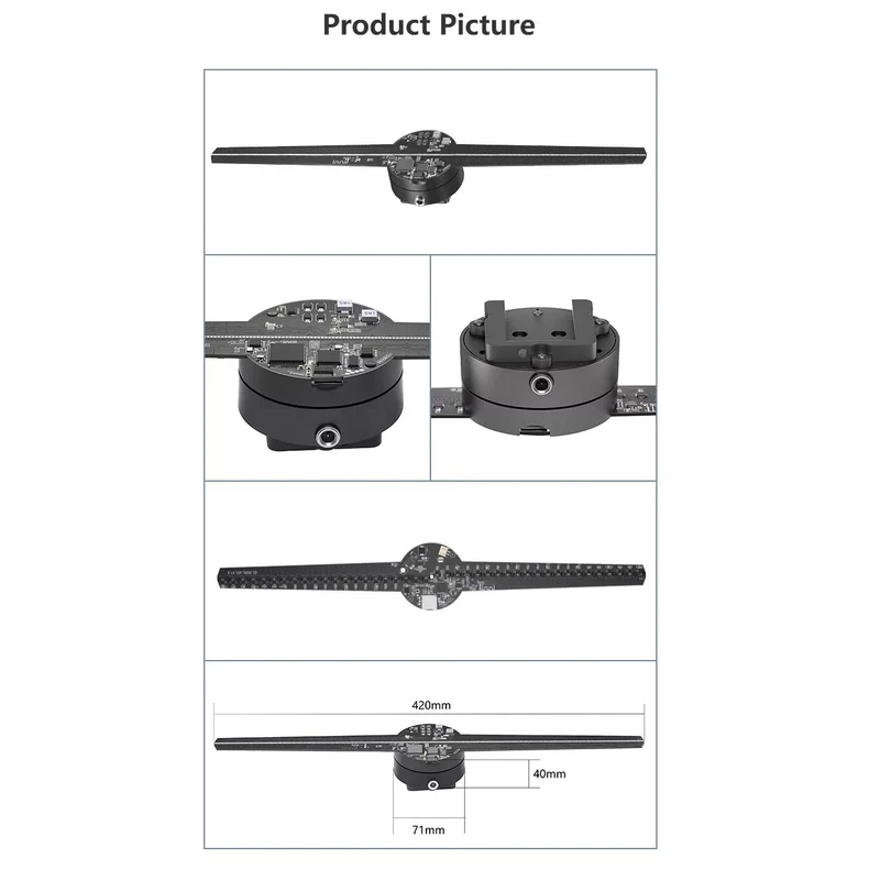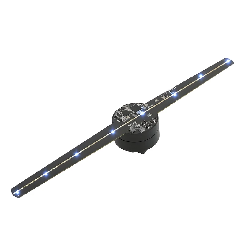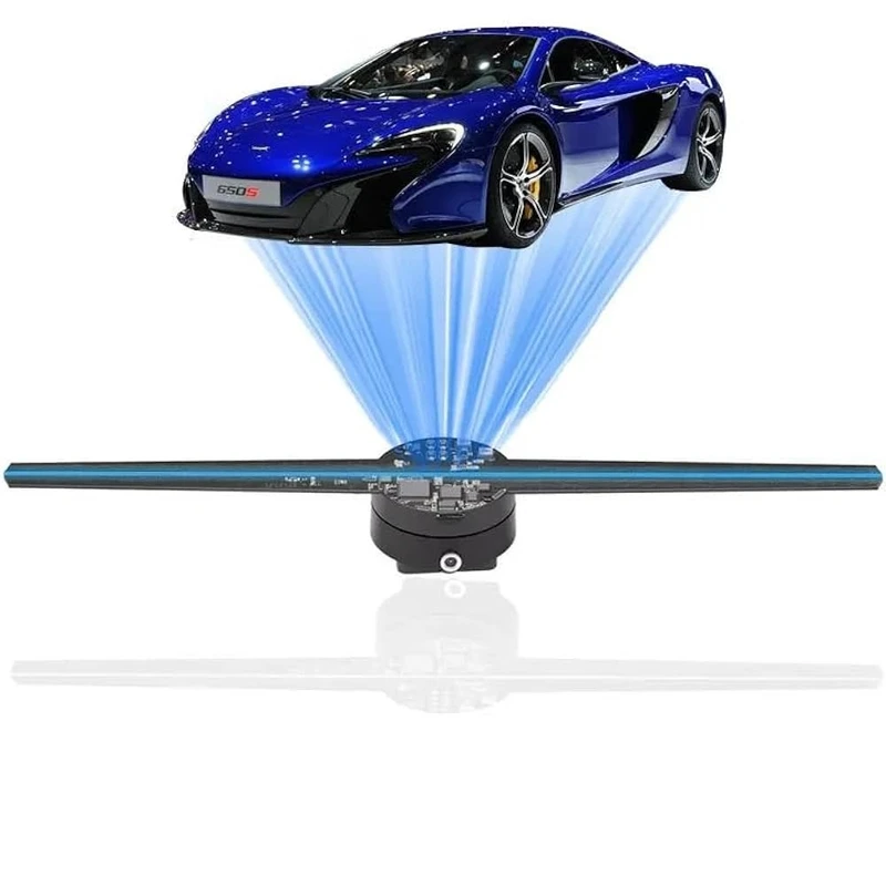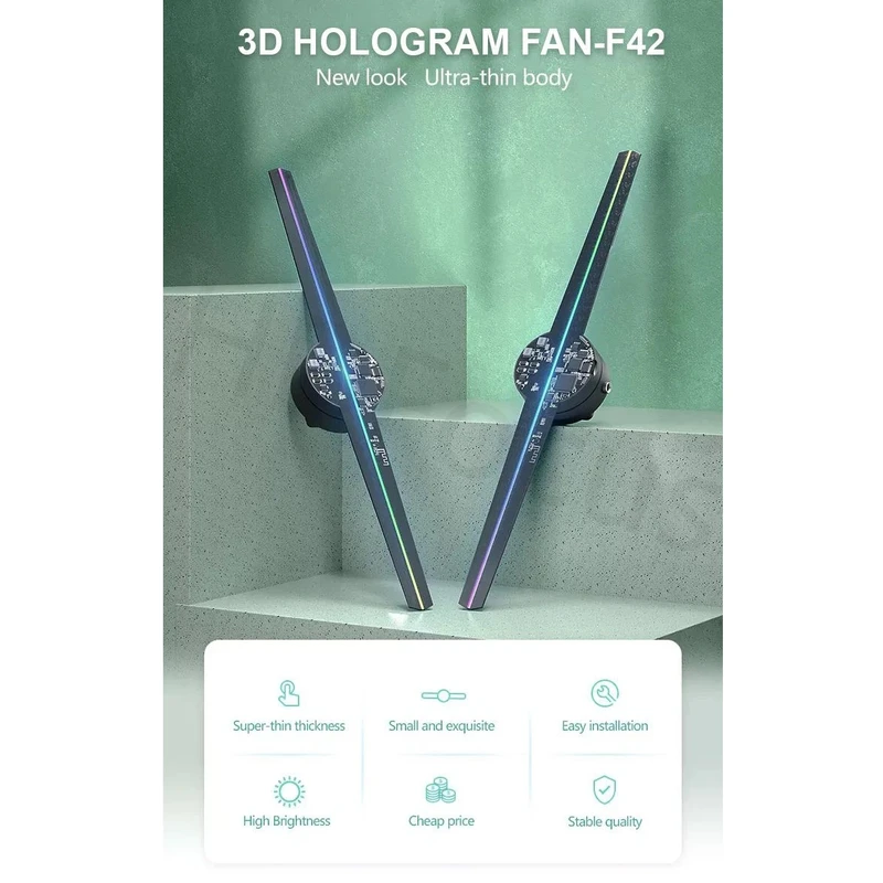 فن هولوگرام سه بعدی (3D) یک نوع پروژکتور یا نمایشگر جدید است که می تواند تصاویر و ویدیوهای شما را از طریق اپلیکیشن یا مموری به صورت سه بعدی پخش کند. فن هولوگرام سه بعدی یک محصول منحصر به فرد است و کاربردهای بسیار گسترده ای از جمله برای تبلیغات، عرضه محصولات، تبلیغات فروشگاهی و مجازی، معرفی محصول و .... دارد. این نمایشگر از فناوری هولوگرافیک برای ارائه تصویر بهره می برد و با وزن و اندازه سبک و جمع و جوری که دارد می تواند به راحتی همه جا مورد استفاده قرار بگیرد. همچنین قابل نصب روی دیوار است و حتی میتواند با قرار گرفتن در کنار تعداد زیادی از فن های دیگر، تصویر سه بعدی واحدی را ارائه کند. نمایشگر سه بعدی فن هولوگرافی مدل HD-F42 جدیدترین و جذاب ترین نمایشگر تبلیغات هولوگرافیک سه بعدی معلق در هوا برای مرکز خرید،فروشگاههای لباس، رستوران، موزه، فروشگاه جواهرات و… میباشد.این دستگاه با استفاده از یک ماژول متحرک ال ای دی باعث ایجاد تصاویر سه بعدی میشود.تصاویر هولوگرافیک که به وسیله چرخش ایجاد میشود باعث جلب توجه افراد میشود.هولوگرام فن می تواند تصاویر رنگی و متحرک را به صورت سه بعدی معلق در هوا در اندازه 42 سانتی متر نمایش دهد. سیستم هولوگرافیک پروجکشن (Holographic Projection) تصویری تمام رنگی با رزولوشن بالا و بدون محدویت مکانی به صورت سه بعدی ارائه می دهد. بینندگان می توانند یک شئ و یا شخص واقعی را روی صحنه ببینند در حالی که با تصویر شئ و شخص مجازی در تعامل هستند. این تصاویر در چشم انسان در فضا با عمق و پرسپکتیو و به صورت معلق دیده می شوند و تجربه ای به شدت نزدیک به واقعیت را در ذهن مخاطب ایجاد می کند. یکی از نکات مهم هولوگرافیک پروجکشن عدم نیاز به استفاده از عینک های مخصوص است و بیننده می تواند به طور مستقیم و بدون واسطه با تصویر مورد نظر ارتباط برقرار کند.پخش تصاویر هولوگرافیک می تواند روی یک صحنه (با تجهیزات خاص) و یا توسط یک پروجکتور روی یک صفحه شفاف و نامرئی ارائه شوند. در این پروژکتور از چراغ های LED استفاده شده و بسته به تعداد LED، سرعت چرخش و وات دستگاه، کیفیت تصویر نیز تغییر می کند. این دستگاه از فرمت های تصویری MP4، AVI، RMVB و JPG پشتیبانی می کند. دستگاه دارای ریموت است و به راحتی می توانید آن را کنترل کنید.