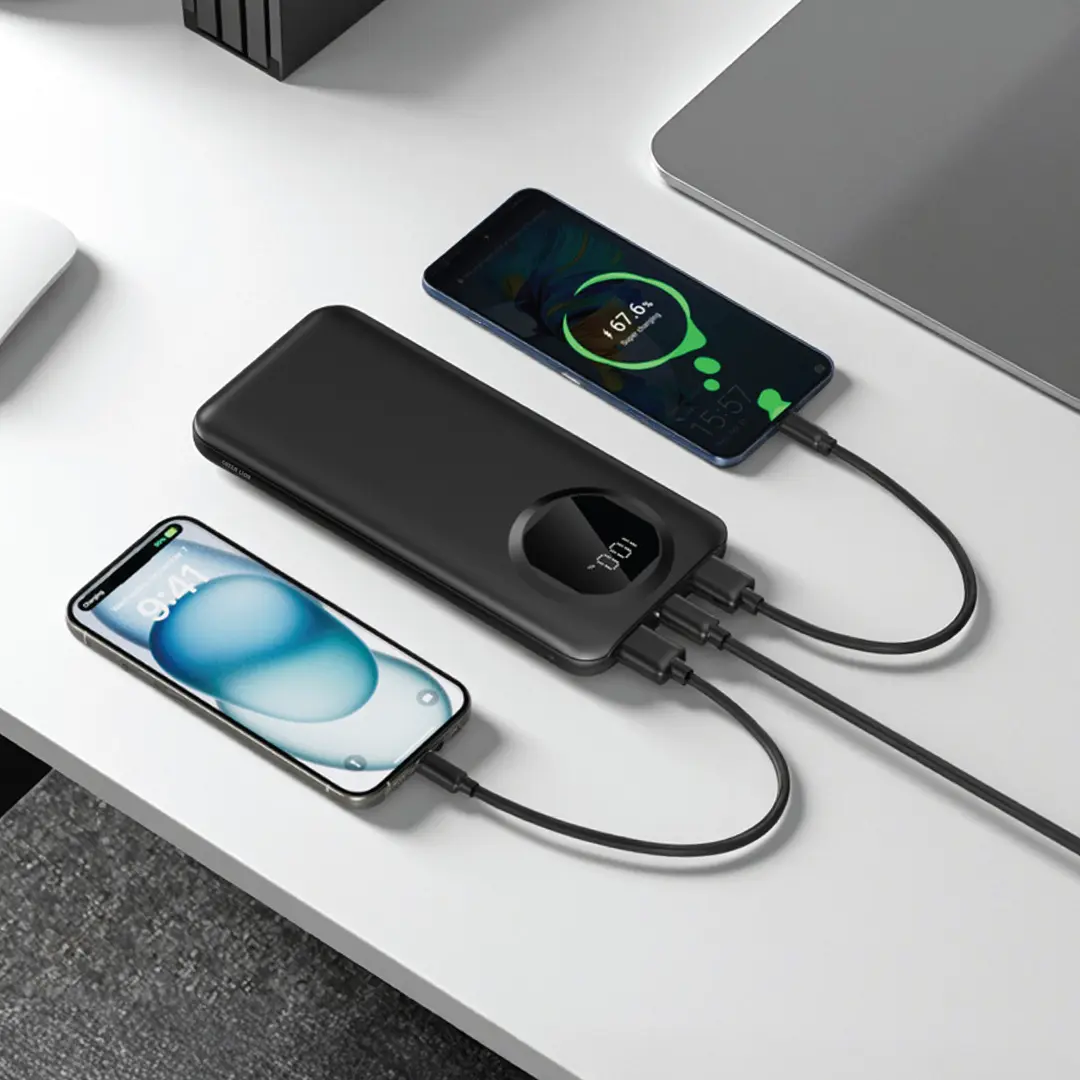 این مدل پاوربانک 10000 میلیآمپر (37Wh) طراحی شده است تا انرژی کافی را برای دستگاههای شما فراهم کند. ظرفیت واقعی 5600mAh (به دلیل تبدیل ولتاژ کمتر از ظرفیت اسمی است)، به شما این امکان را میدهد که چند بار گوشی یا دستگاه هوشمند خود را بدون نگرانی شارژ کنید. این حجم انرژی برای بسیاری از کاربران کافی است تا در سفر، محل کار یا روزمره، همیشه شارژ آماده در دسترس داشته باشند.