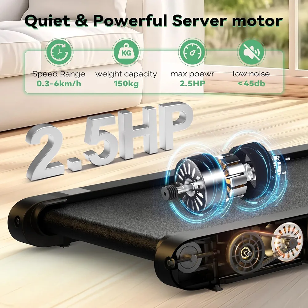 * این تردمیل با ضخامت و ابعاد بهینه، به راحتی در فضاهای کوچک جای میگیرد و میتوانید از آن به عنوان **"تردمیل زیر میزی"** برای پیادهروی حین کار یا مطالعه استفاده کنید.