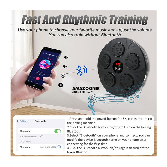 - پخش موزیک همزمان: یکی از جذابترین ویژگیهای این کیسه بوکس، قابلیت پخش موزیک همزمان با تمرین است. شما میتوانید موزیکهای مورد علاقهتان را پخش کنید و با هر ضربه به ریتم آهنگ هماهنگ شوید. این ویژگی انگیزه شما را برای تمرین بیشتر و سختتر افزایش میدهد.