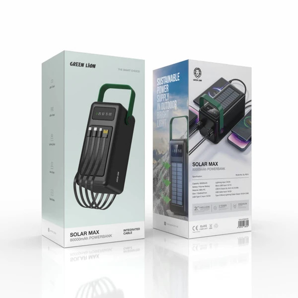 پاوربانک Green Lion Solar Max دارای ظرفیت 50000 میلی آمپر ساعت است و برای تامین برق قابل اطمینان طراحی شده است. این پاوربانک می تواند دستگاه های شما را در تمام طول روز شارژ نگه دارد. این برای مسافرت، کمپینگ، یا دوره های طولانی دور از یک فروشگاه عالی است. خروجی های متعددی دارد. آنها شامل کابل های Type-C، Micro و Lightning با 5V/2A (10W) هستند. همچنین دارای خروجی USB-A با 5V/2.1A (10.5W) می باشد. میتوانید چندین دستگاه مانند گوشیهای هوشمند و تبلتها را همزمان شارژ کنید. همچنین دارای یک پنل خورشیدی برای شارژ سازگار با محیط زیست در فضای باز در مواقعی که برق در دسترس نیست. پاوربانک دارای صفحه نمایش دیجیتال است. عمر باتری را نشان می دهد و به شما امکان می دهد به راحتی میزان شارژ آن را کنترل کنید. همچنین دارای پورت های USB Type-C، Micro USB و Lightning است. اینها سازگاری با بسیاری از دستگاه ها را تضمین می کنند. پاوربانک Green Lion Solar Max برای کسانی که به برق قابل اطمینان در هر مکانی نیاز دارند عالی است. ساخت مستحکم و ظرفیت بالا آن را ایده آل کرده است.