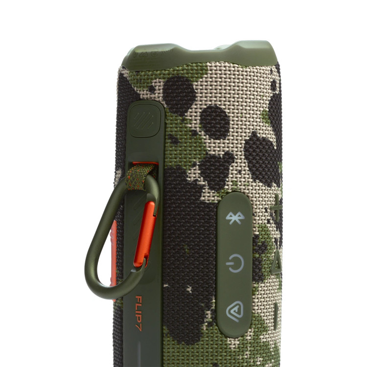 JBL Flip7 در نگاه اول با همان فرم آشنای استوانهای نسلهای قبلی دیده میشود، اما در ابعاد ۸۳×۴۳×۳۰ میلیمتر و وزن ۸۲۶ گرم، کمی فشردهتر و سبکتر شده تا حمل آن راحتتر باشد. دنه از جنس پلاستیک فشردهی ضدضربه و پوشش مشبک پارچهای طراحی شده که حس نوستالژیک محصولات کلاسیک JBL را حفظ میکند.این اسپیکر دارای بند و قلاب مخصوص حمل است تا کاربر در سفر یا فعالیتهای بیرونی بتواند آن را بر روی کیف، دوچرخه یا دست آویزان کند. باوجود طراحی ساده، تمام جزئیات از جایگاه کلیدها گرفته تا پورتها و نشانگرهای LED، بهصورت ارگونومیک و خوشدست تنظیم شدهاند. چراغ نشانگر روی بدنه وضعیت دستگاه را در حالت روشن یا شارژ نمایش میدهد. اما نقطه عطف طراحی Flip7 مقاومت آن در برابر شرایط محیطی است.این اسپیکر دارای استاندارد IP68 است؛ به این معنی که کاملاً ضد گردوغبار بوده و میتواند تا عمق ۱.۵ متر زیر آب و به مدت ۳۰ دقیقه کاملاً سالم باقی بماند. چنین ویژگیای آن را مناسب برای استفاده در ساحل، کنار استخر یا کوهپیمایی میکند. دکمههای لاستیکی روی بدنه نیز در برابر رطوبت و ذرات مقاوم هستند و عملکرد خود را حتی در زیر باران حفظ میکنند. در مجموع، طراحی Flip7 بیانگر فلسفه JBL است: دوام بالا، قابلحمل بودن حقیقی، و ظاهر ساده اما جذاب که بهخوبی با هر سبک زندگی سازگار میشود.